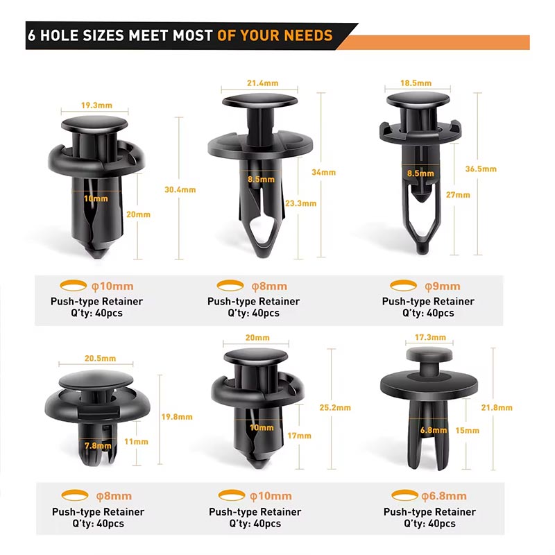 Los kits de clips de retención de empuje para automóviles de alta calidad de Qeepei, diseñados para proporcionar soluciones de fijación confiables para profesionales y entusiastas de la automoción. Este kit de 240 piezas incluye varios tamaños de tornillos de expansión de alta calidad y sujetadores de remaches a presión, perfectos para asegurar parachoques, paneles decorativos y otros componentes automotrices.
