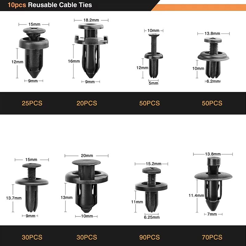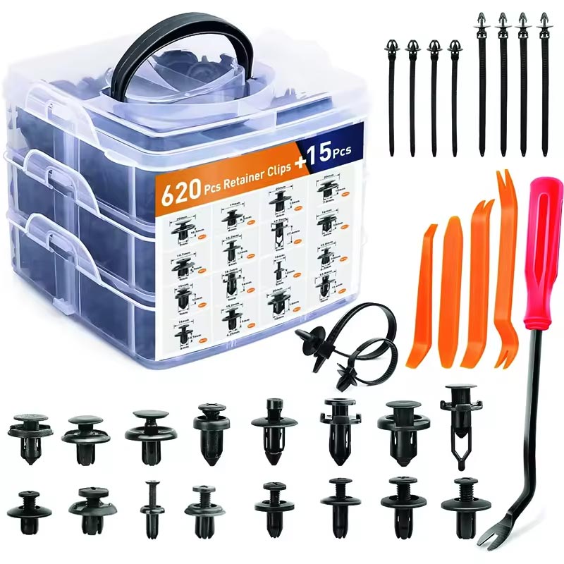 Nuestro juego de clips de remaches de guardabarros de parachoques de nailon para automóvil está diseñado para proporcionar una solución confiable y segura para diversas aplicaciones automotrices. Con 635 piezas de clips de nailon de alta calidad, este kit incluye una variedad de tamaños y tipos, lo que garantiza una cobertura integral para todas sus necesidades de sujeción. Cada clip está diseñado para soportar los rigores del uso diario, lo que garantiza un rendimiento y una durabilidad duraderos.