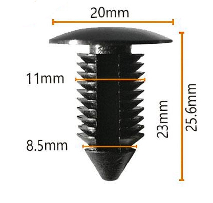 La longitud total del sujetador es de 25,6 mm, el ancho es de 20 mm y la altura de la cabeza es de 11 mm.